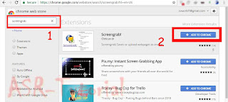 - Cari dengan nama screengrab yang ditunjukan kotak merah no.1, kemudian klik tombol add to chrome pada kotak merah no.2